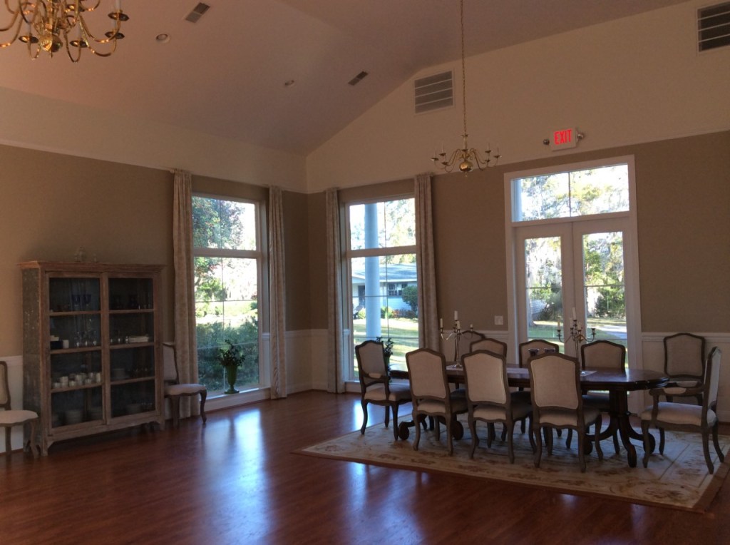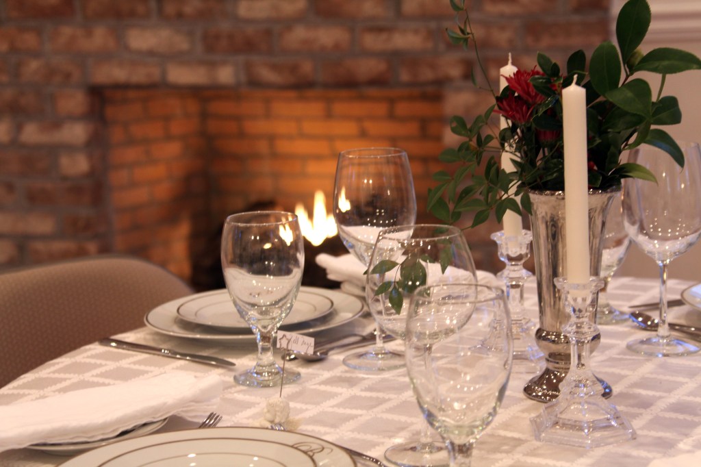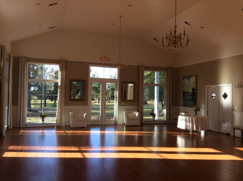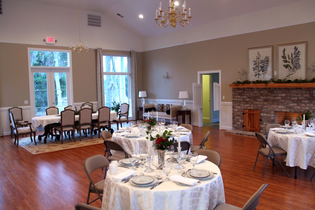 The modern 1200 square foot Banquet Hall features an elegant head table. It includes a fireplace and floor to ceiling bright windows all around. Seating capacity for the ballroom is a up to 80-90 people, depending on your custom configuration.